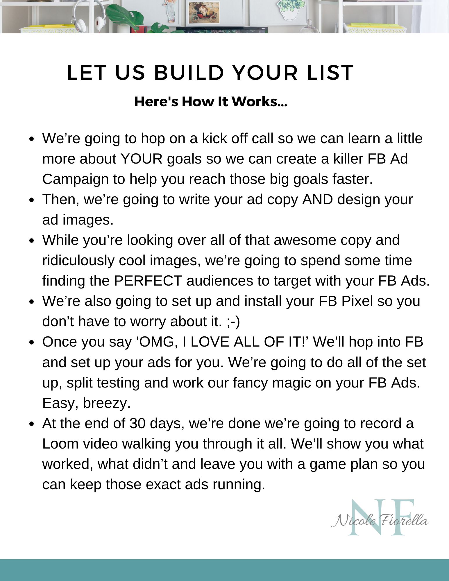 Once you say ‘OMG, I LOVE ALL OF IT!’ We’ll hop into FB and set up your ads for you.